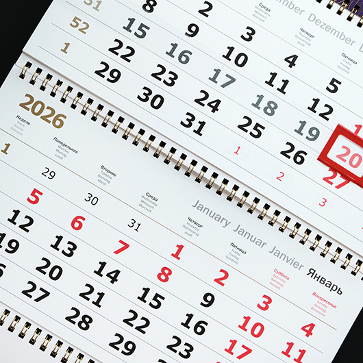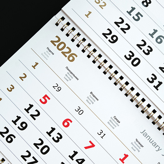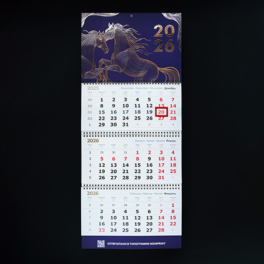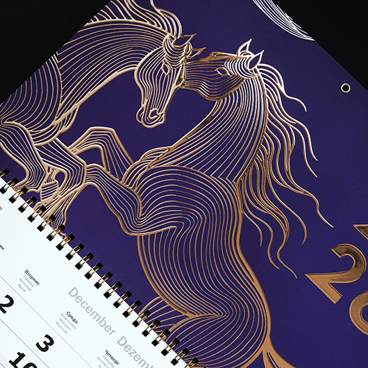 Элегантный квартальный календарь с силуэтами лошадей на топе, выполненными золотой 3D фольгой. Блестящие акценты добавляют премиальности и динамики, превращая календарь в эффектный элемент фирменного стиля.