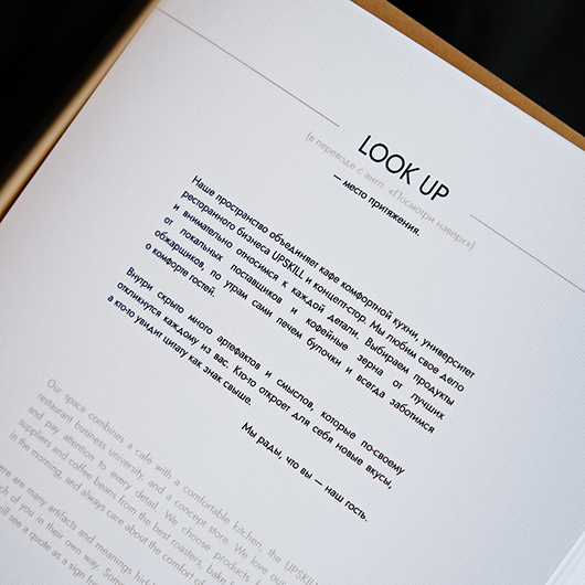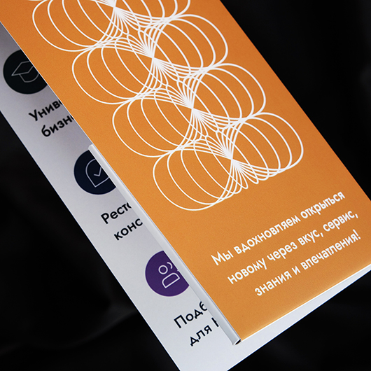 Элегантное меню, блок которого выполнен из дизайнерской бумаги с выразительной фактурой «лён». Такая текстура придаёт изделию премиальный вид и приятные тактильные ощущения, подчёркивая стиль и атмосферу заведения.