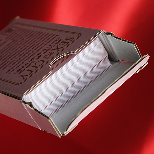 Настольная карточная игра, упакованная в прочную коробку из микрогофрокартона (МГК). Название игры выполнено красной 3D фольгой, что создаёт эффектный акцент и подчёркивает премиальность дизайна. Прочная конструкция и выразительное оформление делают упаковку не только функциональной, но и визуально привлекательной.